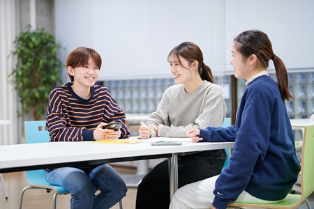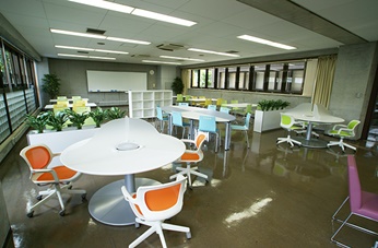 ホール内に軽食コーナーを設置し飲食することができ、休憩時間にもくつろげる場所となっています。複数名で使用できるテーブルが配置され、グループワークにも利用できます。