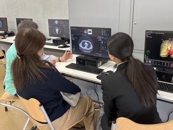 CTやMRI・マンモグラフィなどの装置を間近に見たり触れたりして頂きながら、内臓模型や最新のAI画像解析などのブースでも様々な体験に足を運ばれていました。各ブースを回られる中で、本学の学生スタッフや教員との会話を楽しんでおられました。